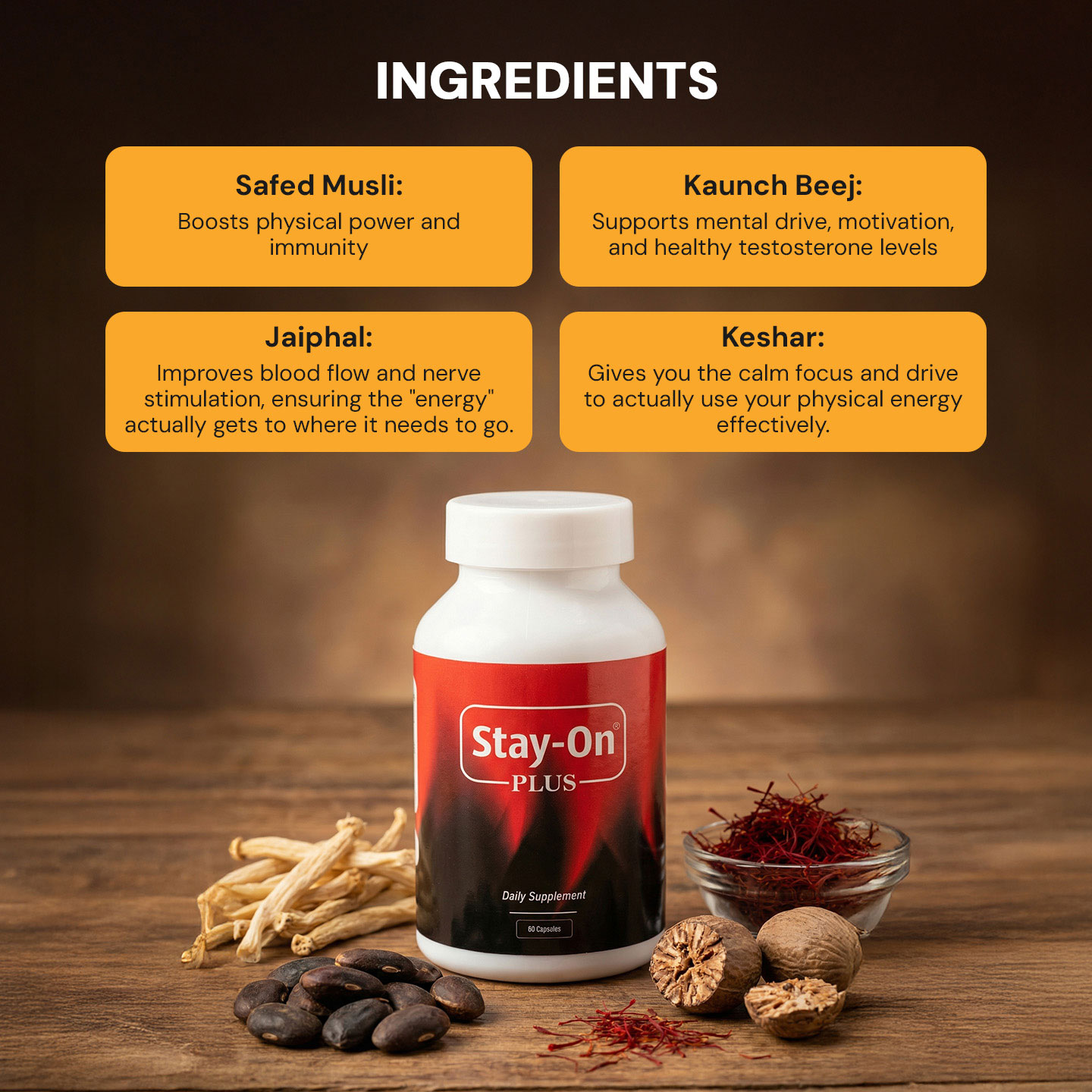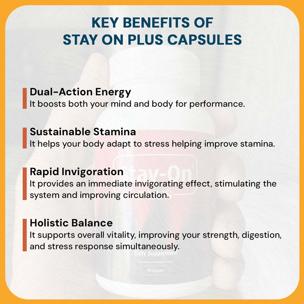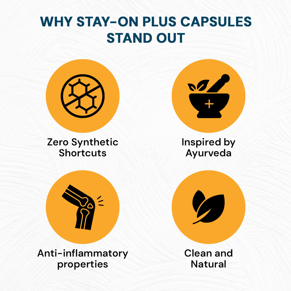 كبسولات ستاي-أون بلس صُممت لتكون مكملًا غذائيًا لطيفًا قائمًا على النباتات، مستوحى من تقاليد الأيورفيدا. صُممت لتكون جزءًا من روتينك اليومي للعناية بالصحة، حيث تجمع هذه التركيبة العشبية بين مكونات طبيعية مجرّبة عُرفت في الممارسات التقليدية بدعمها للتوازن والحيوية.