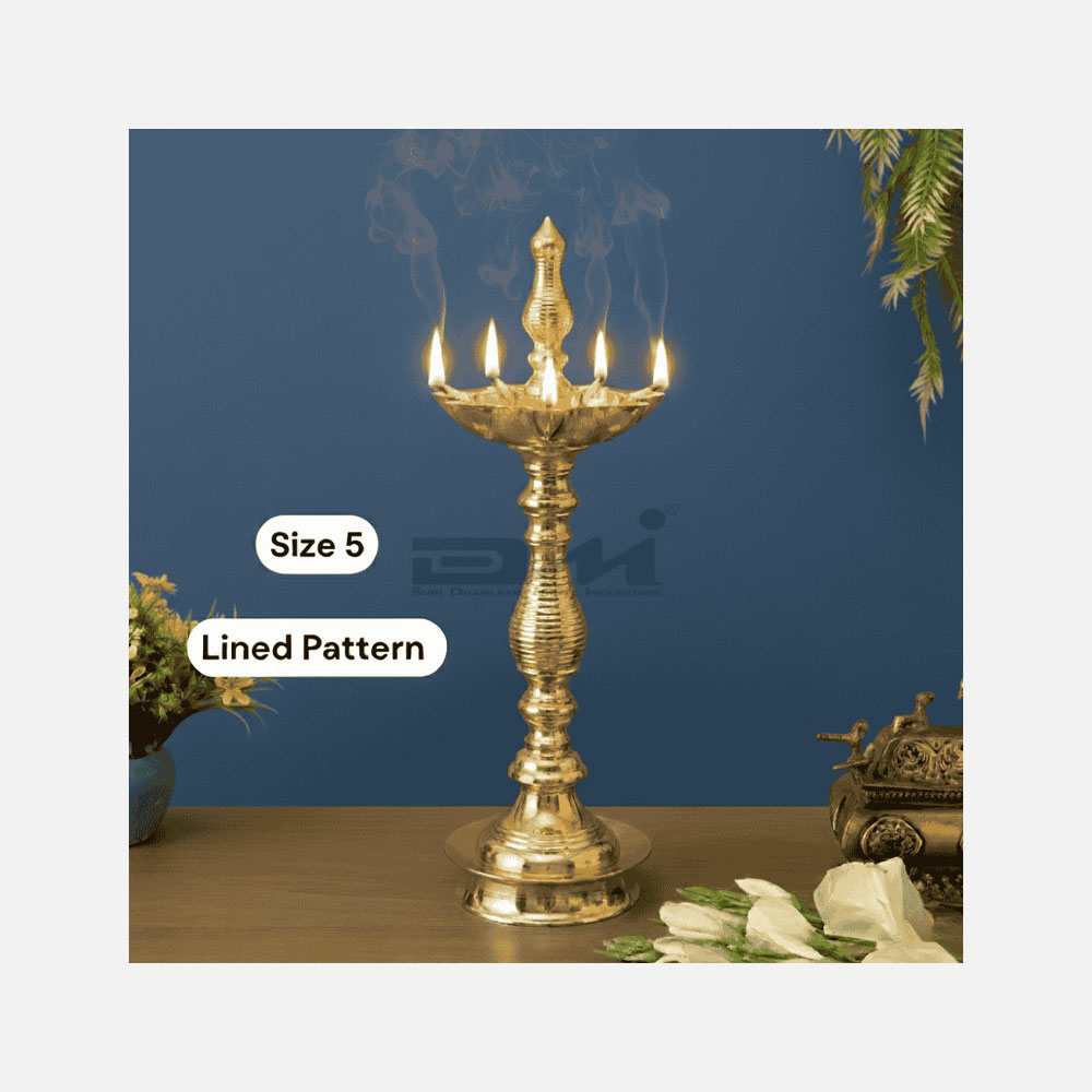 DMI 7 Faced Kalas/Kalash Samai Lined Pattern Stand (10 Inches) – Size No.5 crafted in pure legacy brass, featuring a Kalas at the centre and an elegant lined stand. Designed to hold seven flames, it symbolises prosperity, balance, and divine blessings, creating a steady and auspicious glow during worship.