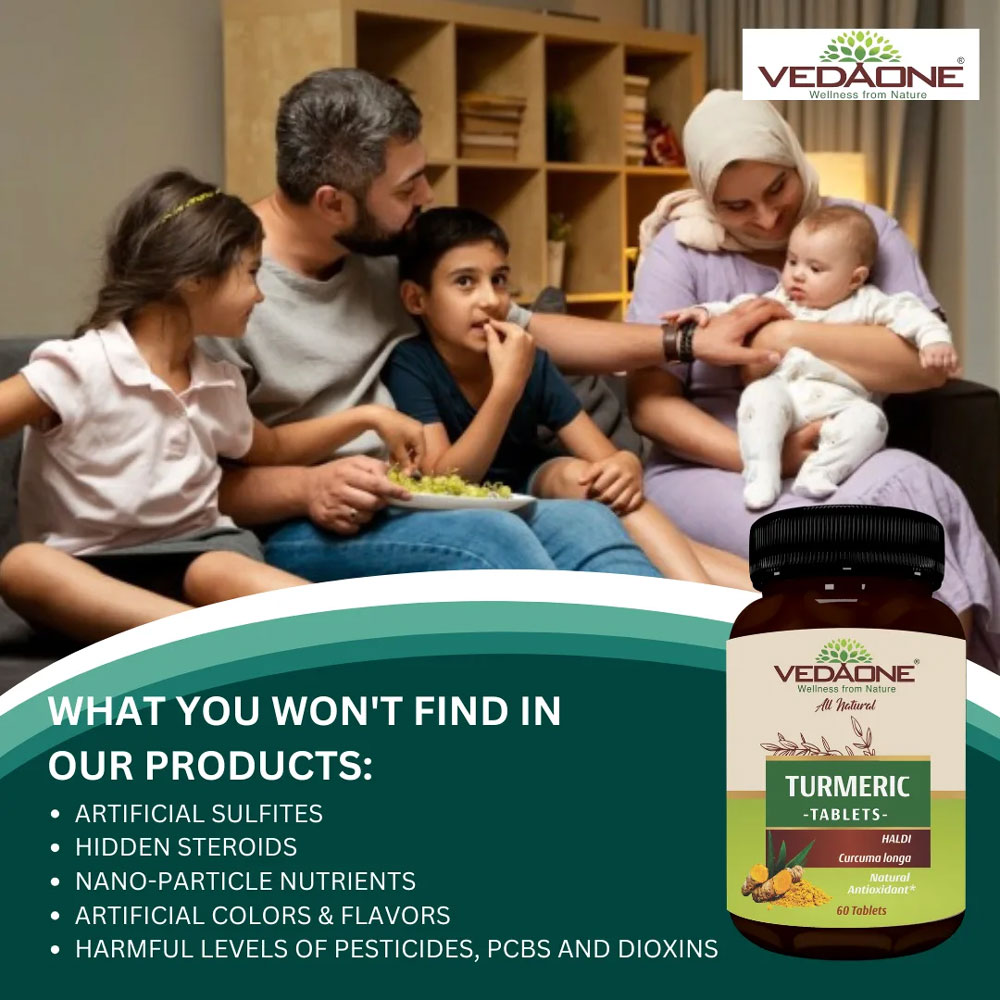 Vedaone Turmeric Tablets are designed as a wellness product. They are not intended to address specific conditions. Please seek medical advice for joint-related concerns.